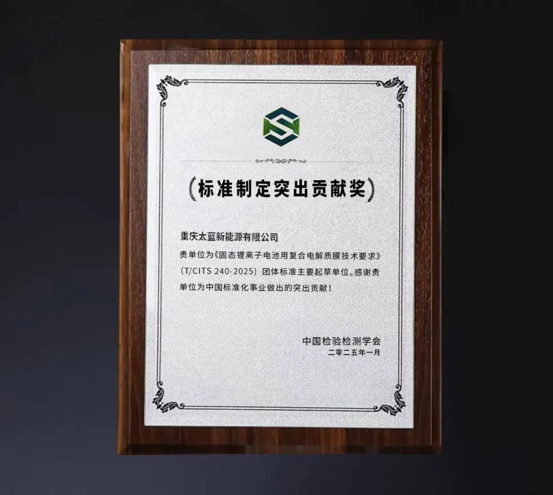 在全球动力电池产业加速转型的关键节点,固态电池技术再次站上台前。近日,由中国检验检测学会统筹主导、太蓝新能源等产学研机构联合发起的《固态锂离子电池用复合电解质膜技术要求》标准编制工作完成。作为该标准的主要起草单位,太蓝新能源凭借在固态电解质领域积累的多项核心专利,主导了材料制备工艺、相关技术流程等关键技术指标的制定,彰显太蓝在固态电池领域的技术创新高度,被授予固态电池标准制定突出贡献奖。