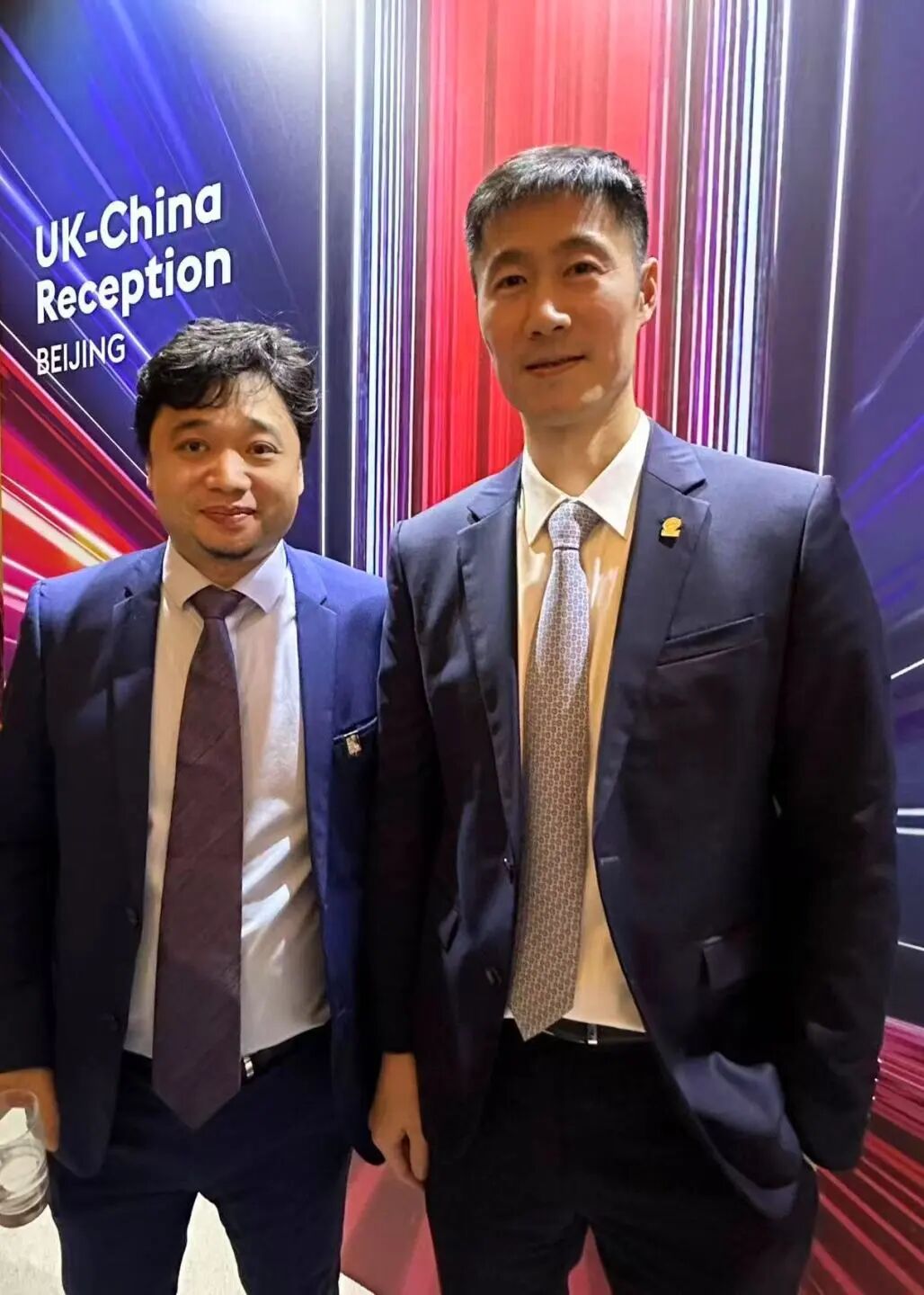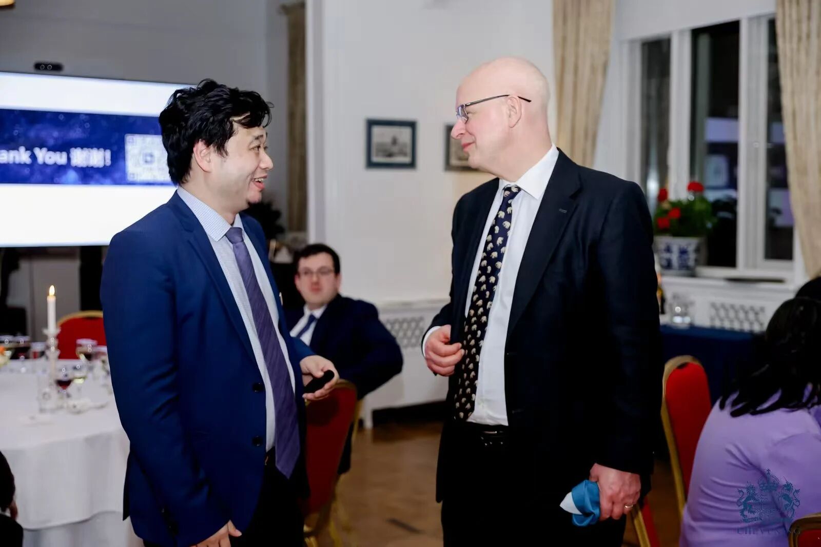 左:欢迎会现场英国商业和贸易大臣彼得·凯尔做分享;右:解洪兴主任与共同受邀的中国乒协主席、原乒乓球世界冠军王励勤在活动上合影